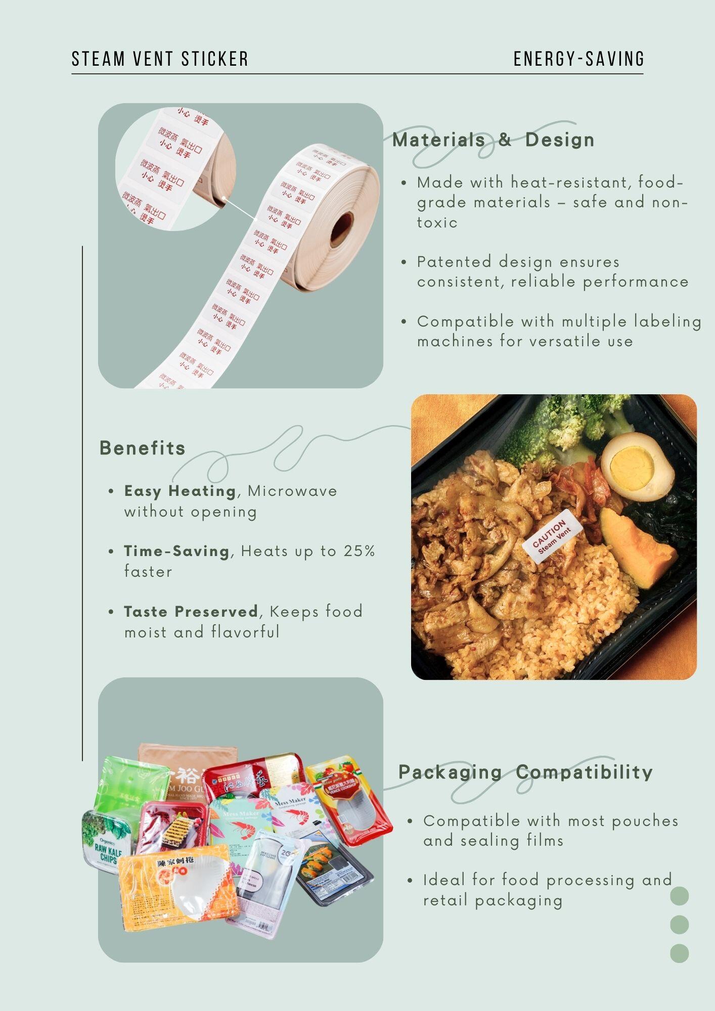 Miếng dán tự thoát hơi dùng cho lò vi sóng giúp rút ngắn thời gian hâm nóng thức ăn bằng lò vi sóng khoảng 25%, nâng cao hiệu quả phục vụ. Đồng thời, nó đơn giản hóa quy trình làm việc, giảm tiêu thụ năng lượng và giúp các công ty đạt được giá trị cao hơn về cả hiệu quả và tính bền vững.